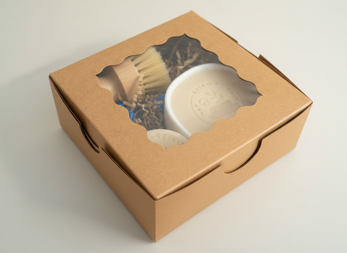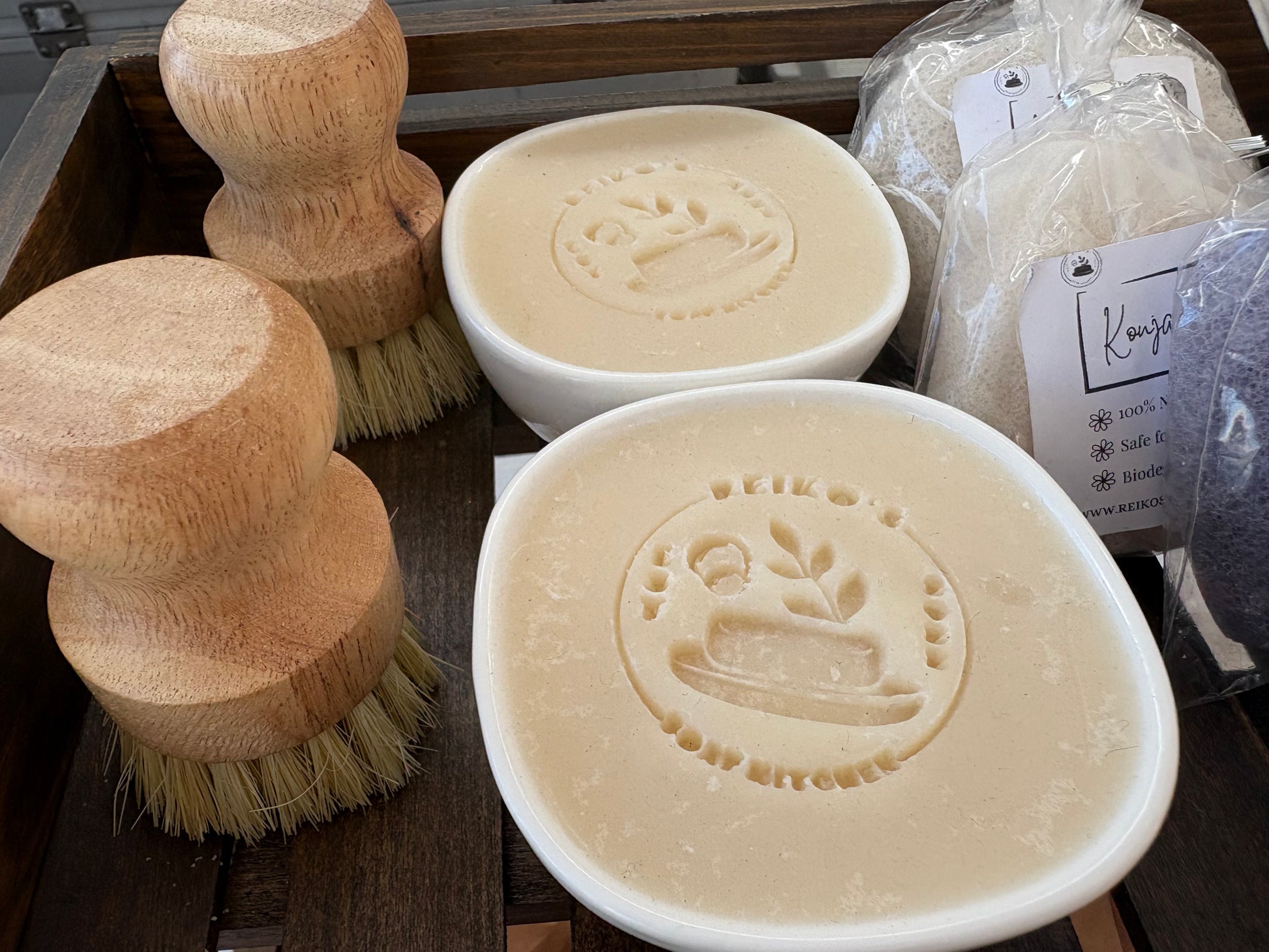 Introducing our complete Zero-Waste Solid Dish Soap Set — a beautifully curated, eco-friendly kitchen essential. Each set includes a handcrafted solid dish soap poured into a reusable ceramic dish, a natural bamboo scrub brush, and a 4oz refill bar for extended use. Thoughtfully packed and embossed with the Reiko’s Soap Kitchen logo, this set makes both your sink and your sustainability routine feel elevated.